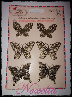 - Y por último estas preciosas mariposas metálicas en oro viejo para decorar. Vienen tres modelos diferentes en total 6. En la parte de atrás no llevan nada, solo un pequeño cuadradito con pegamento a doble cara para sujetarlas en el cartón.