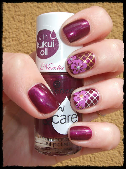 La manicura es muy sencilla de realizar, os explico: Apliqué una capa de base protectora y dos capas del esmalte granate. En las dos uñas centrales estampé el diseño de la rejilla una con el dorado y otra con el plata. Luego estampé las dos flores de diferente tamaño con el tono rosa y para darle un toque mas de color puse un punto con la ayuda de un dotting tool en el centro de las flores, intercambiando el plata y el dorado. Para sellarlo todo una capa de top coat y listo!