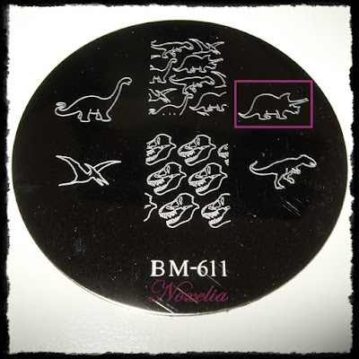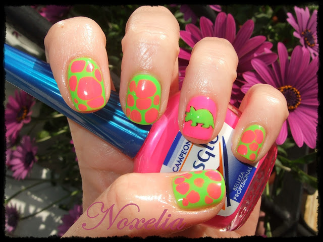 Siii una manicura con huevos de dinosaurio y diseño de un Triceratops!!! jajaja Me apeteció combinar estos dos colores con la técnica de bobblicure y así es como me quedó.