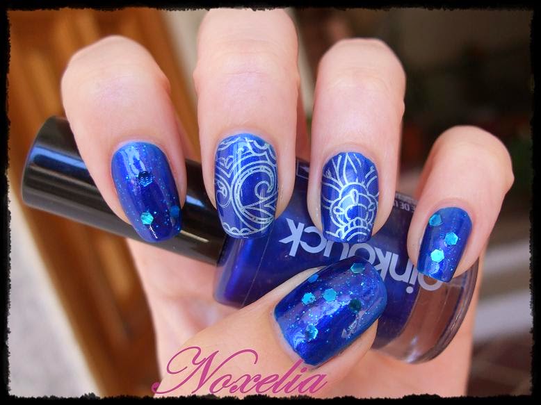 El esmalte base que he utilizado me tocó recientemente en el sorteo de Patrizia que os enseñé aquí. El esmalte de glitter me lo regaló "La jefa" mi queria Lorena Skeletonnails, he de reconocer que los dos hacen una combinación super bonita, gracias chicas!!! El de glitter además de llevar los trozitos mas grandes lleva purpurina pequeña también en azul.