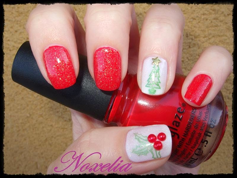 Os explico como la he realizado: Lo primero de todo proteger las uñas con la base y luego aplico una capa de esmalte rojo en el índice, corazón y meñique, una capa de blanco en pulgar y anular. Después aplico una capa del glitter por todas las uñas. En las uñas que tienen base blanca estampado en verde el diseño del árbol y las hojas de muérdago. En lo alto del árbol pongo la tachuela de estrella y las medias perlas rojas al lado de las hojas. Protejo todo con el top coat y listo.