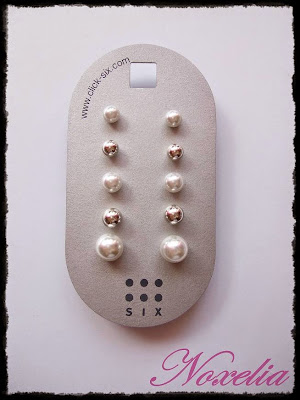 - 5 pares de pendientes de bolita de Six. Esta tienda no la tenemos en mi ciudad y entré para cotillear cositas y tengo que decir que me gustaron muchos de los complementos que tienen pero al final me decidí coger estas bolitas en color plata y perla. Son de tres tamaños diferentes y su precio fue de 4.95 €. Mi penko aprovechó y se compró también unas mini piedras para el agujero que lleva en la oreja (no les hice foto :-( )
